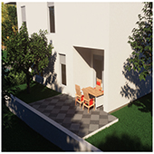 The apartment consists of an entrance hall, an open-plan living room with dining area and kitchen with access to the terrace and garden, one bedroom, and a bathroom.