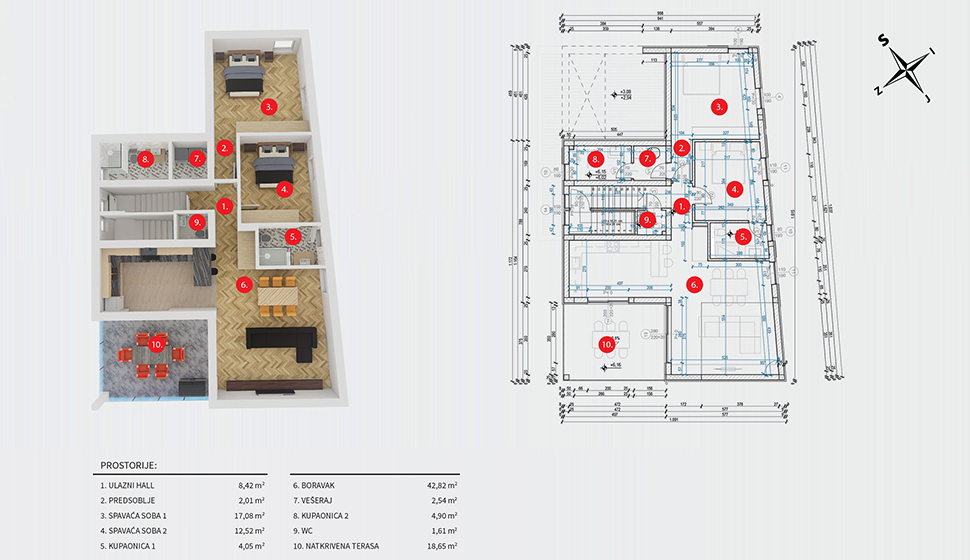 Stan S4 – Moderan dvosoban penthouse smješten na drugom katu, zatvorene površine 96,65 m², s natkrivenom terasom od 18,65 m². Stanu pripadaju dva vanjska parkirna mjesta od 12,50 m² i 12,77 m². Ukupna obračunska površina (NKP): 112,29 m².